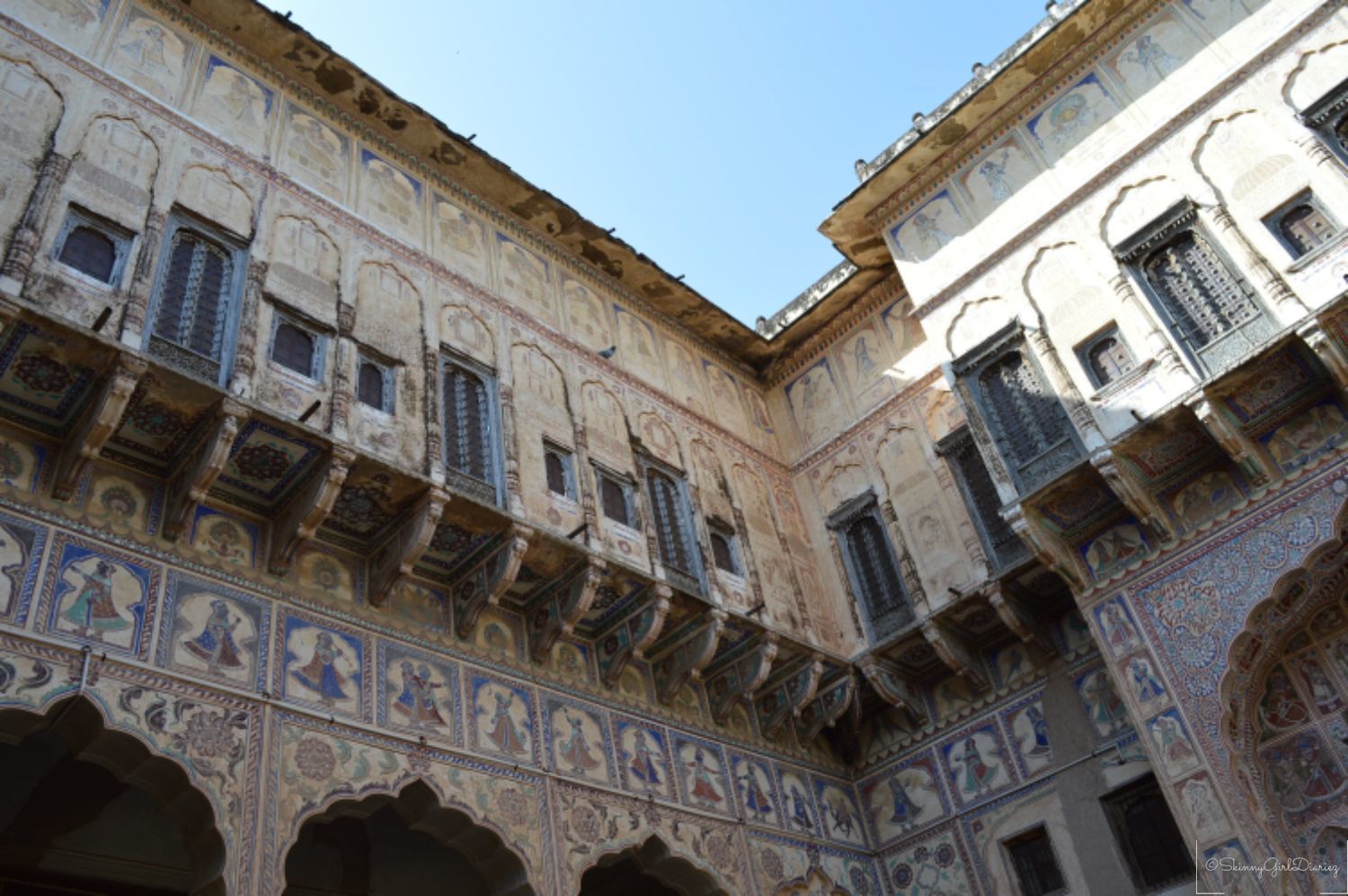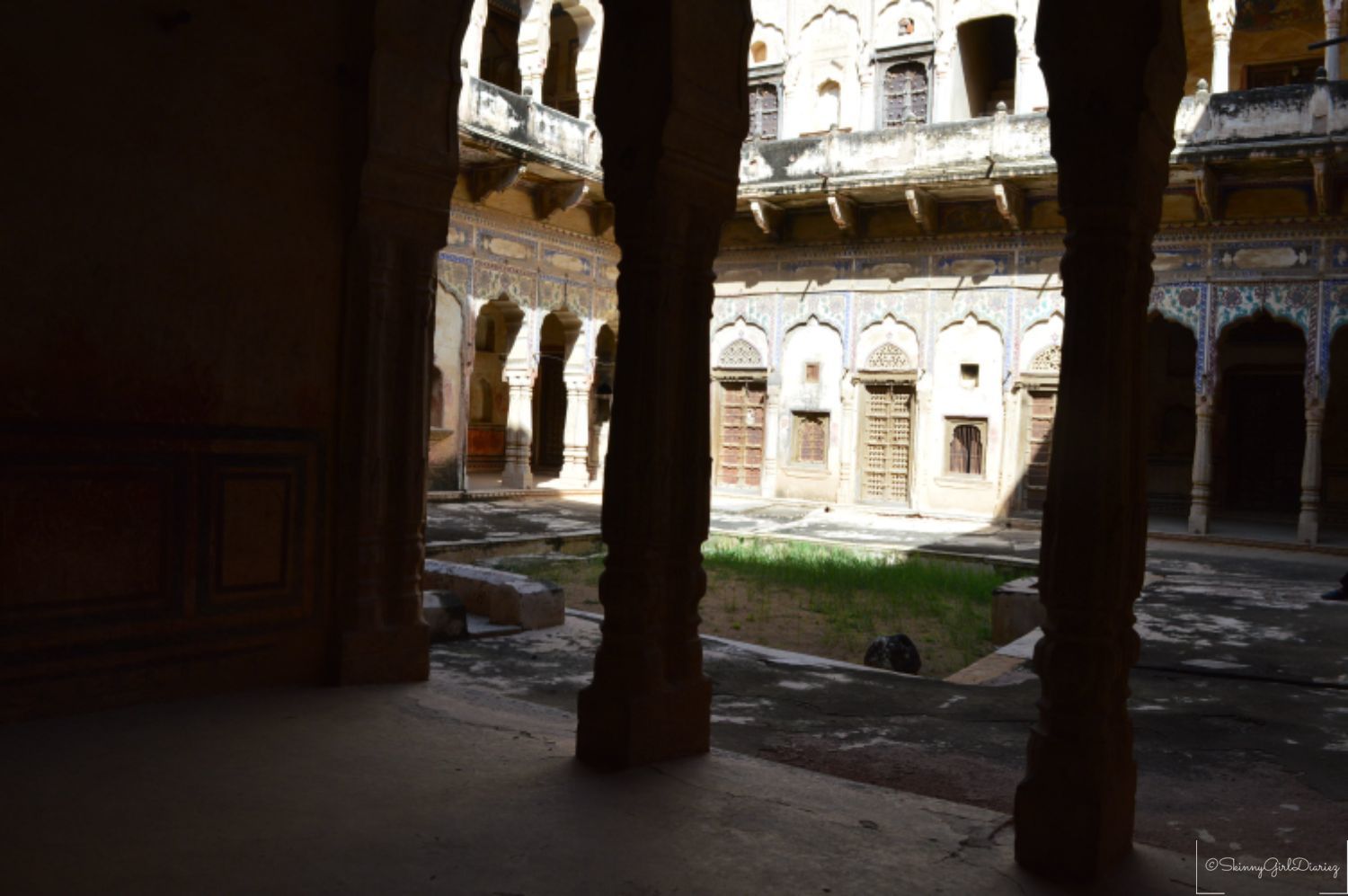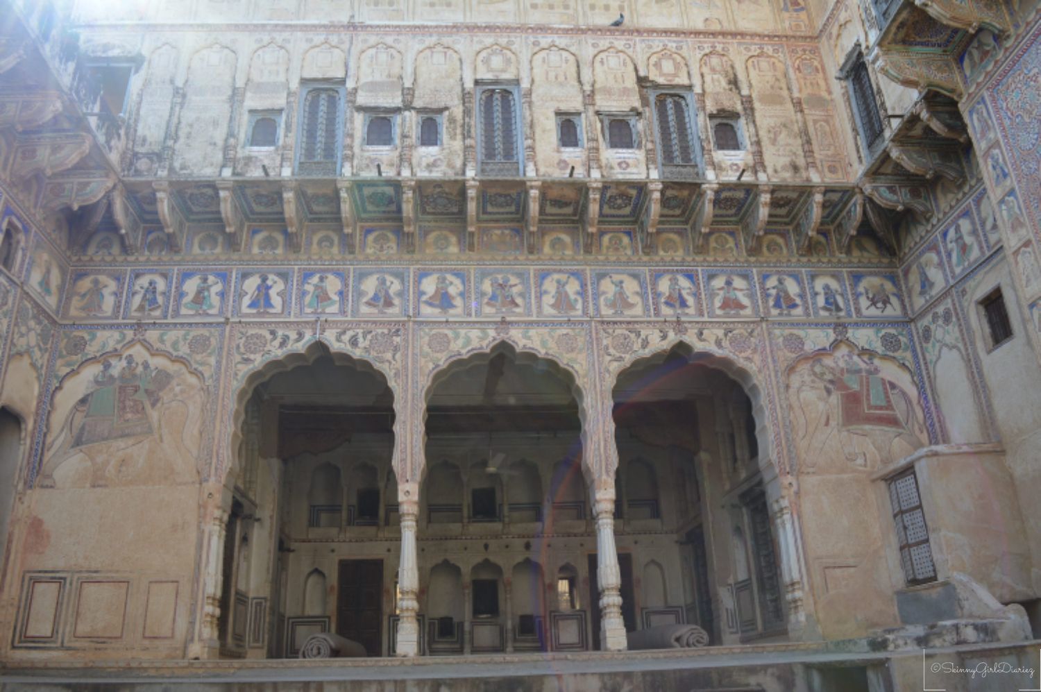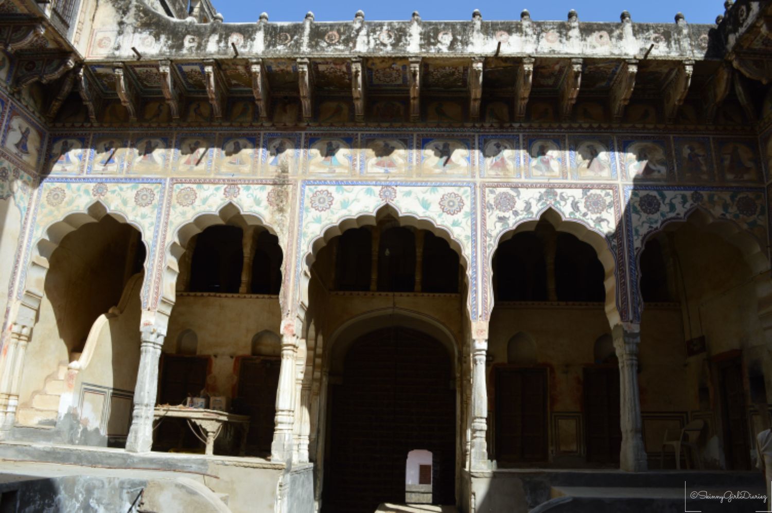 The Jhunjhunwala Haveli was one of which I had visited. This exemplifies a traditional and typical example of the Rajasthani architecture. The main features are the tall ceilings and courtyards inside. The walls and pillars have beautiful depictions. The entire architecture of the haveli has a story to tell, via the beautiful fresco paintings.
