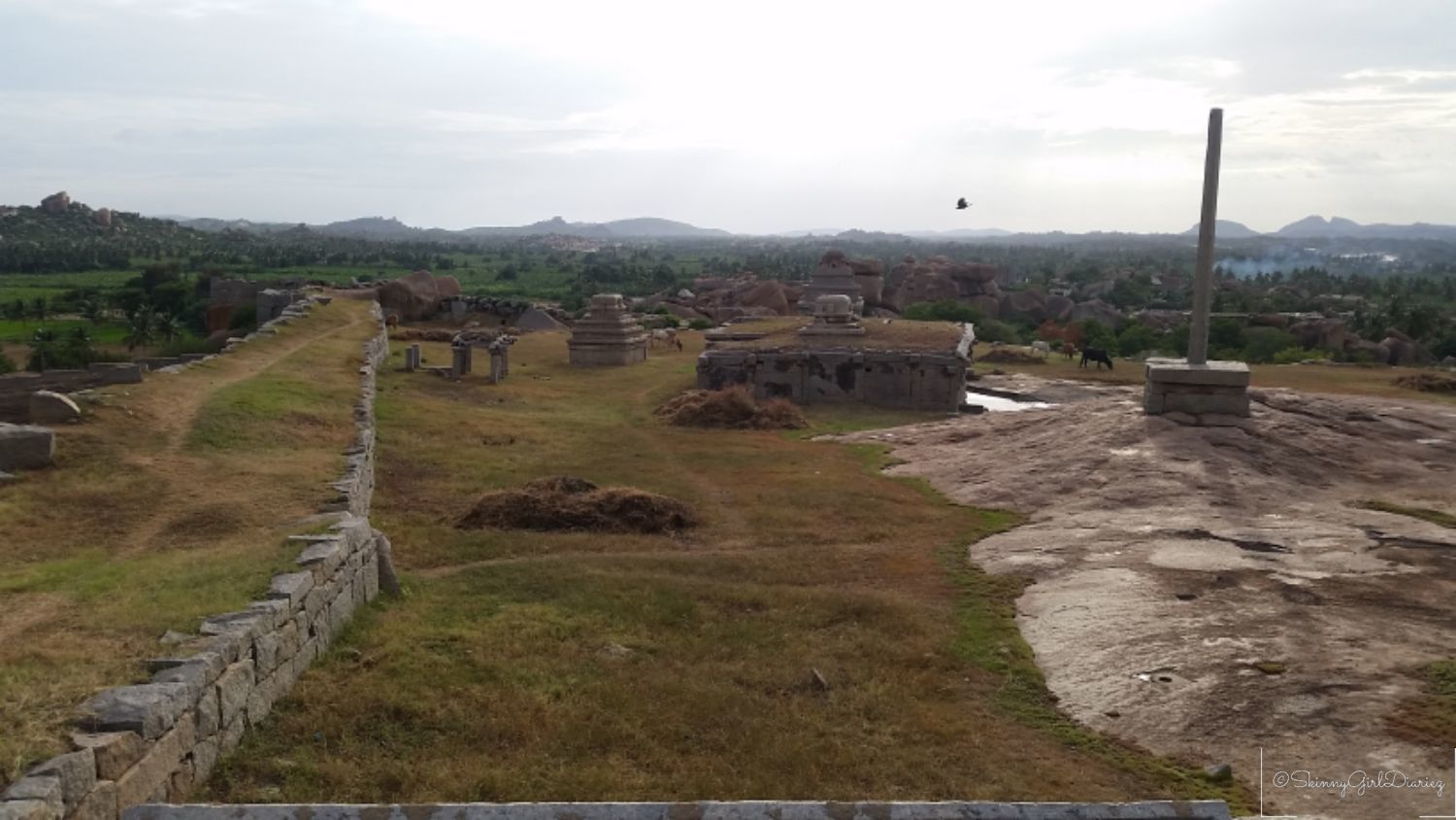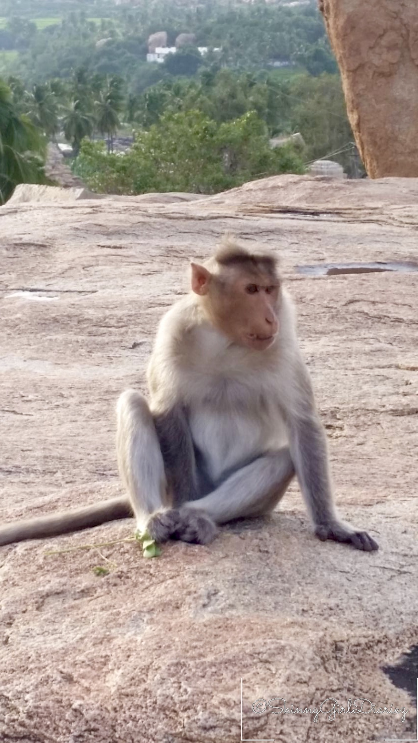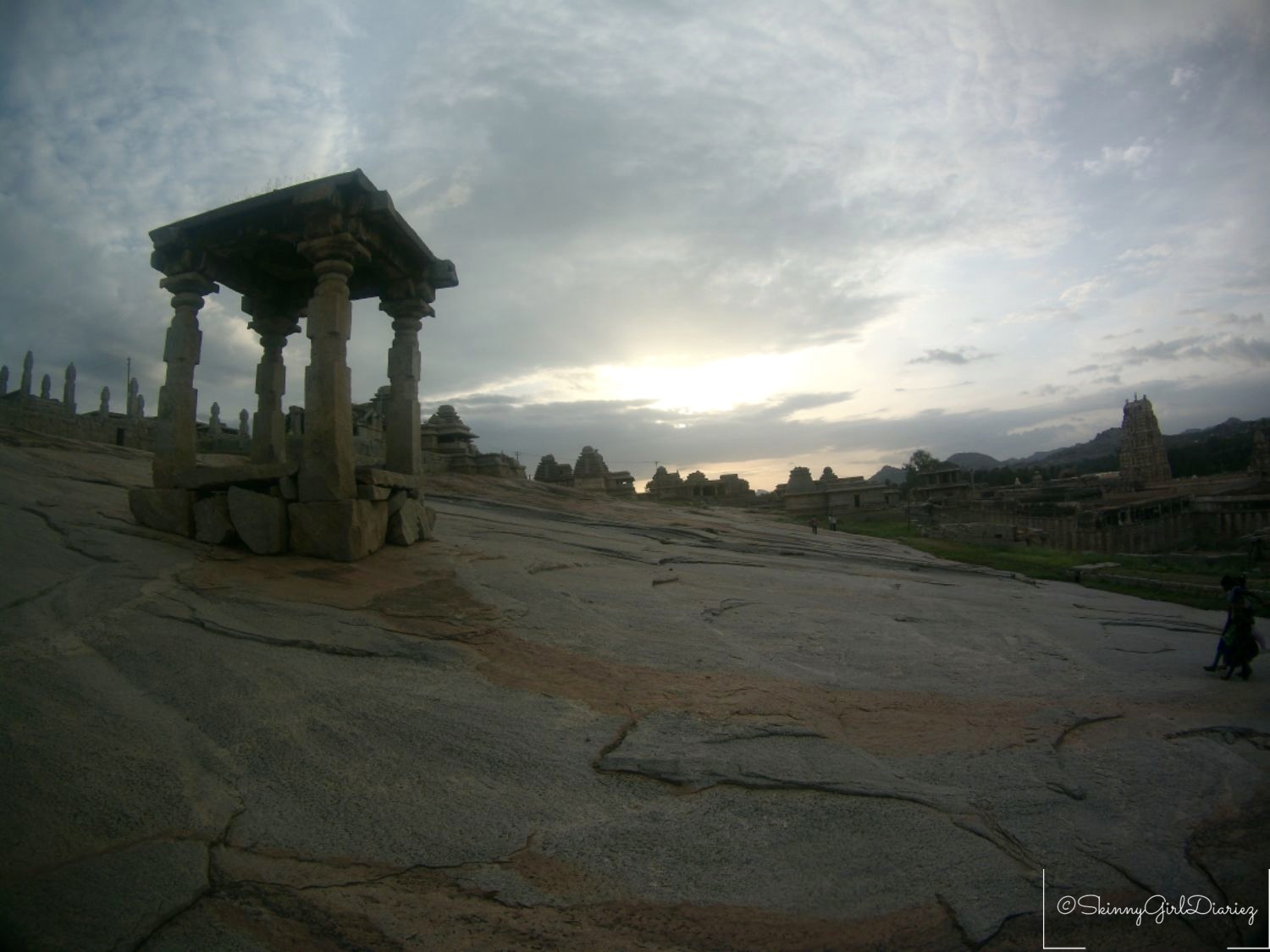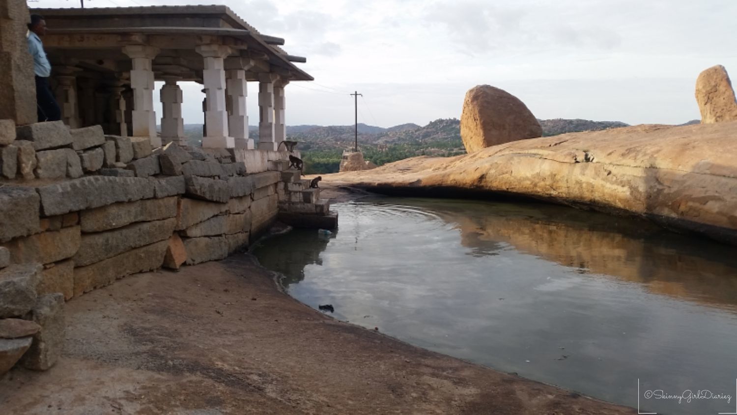 The walk up hill is breathtaking, as you can see. It was almost time for sunset. Once you reach the top of the hill, you get an ariel view of Hampi and there are a large number of temples, archways and pavilions. Another famous temple called the Moola Virupaksha Temple, sits on top of this hill and has a pond that surrounds it, it was surrounded by monkeys taking a dive. It was fun watching them shove each other into the water. The Virupaksha Temple is visible from all the sides. The temperature did dip a bit, and was really windy.