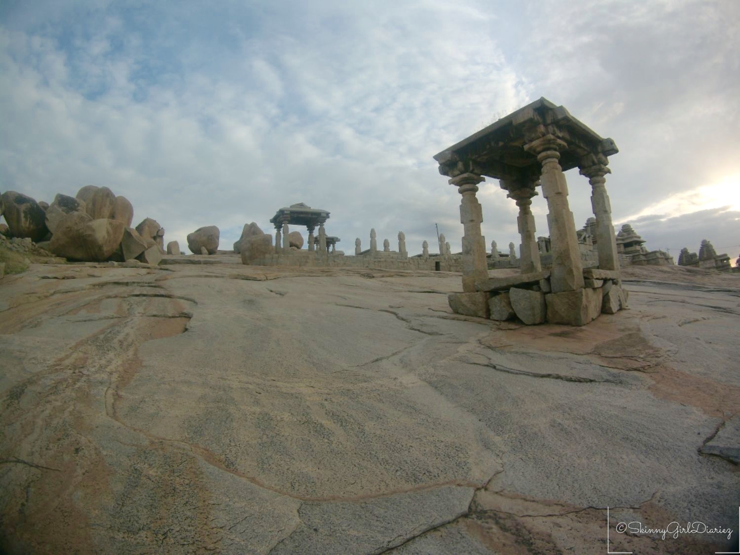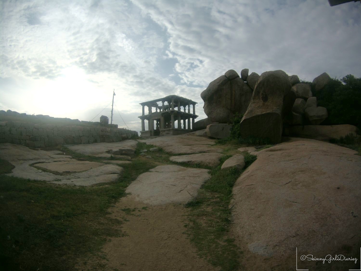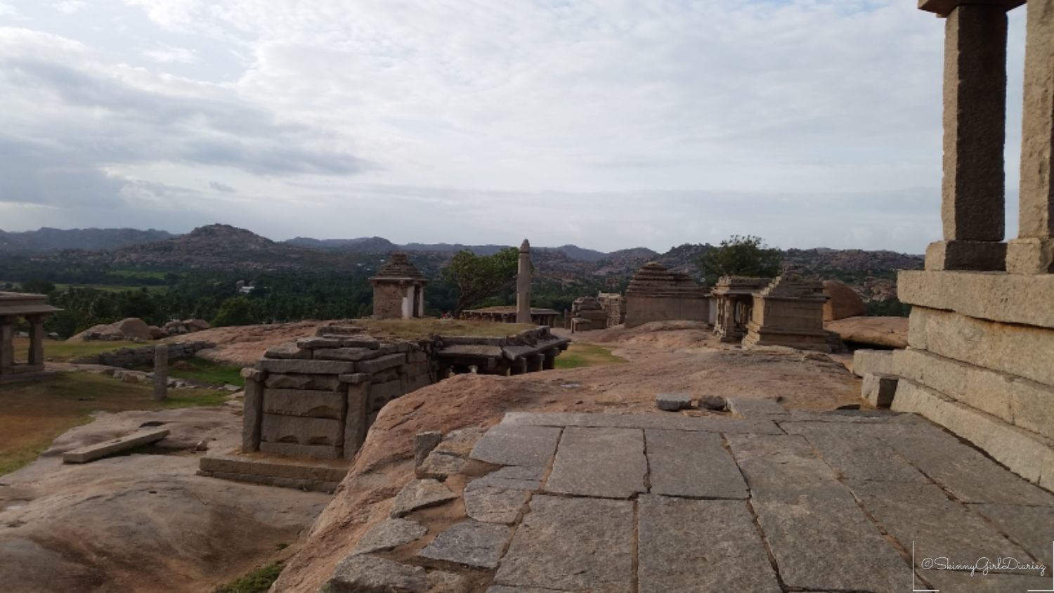 The walk up hill is breathtaking, as you can see. It was almost time for sunset. Once you reach the top of the hill, you get an ariel view of Hampi and there are a large number of temples, archways and pavilions. Another famous temple called the Moola Virupaksha Temple, sits on top of this hill and has a pond that surrounds it, it was surrounded by monkeys taking a dive. It was fun watching them shove each other into the water. The Virupaksha Temple is visible from all the sides. The temperature did dip a bit, and was really windy.
