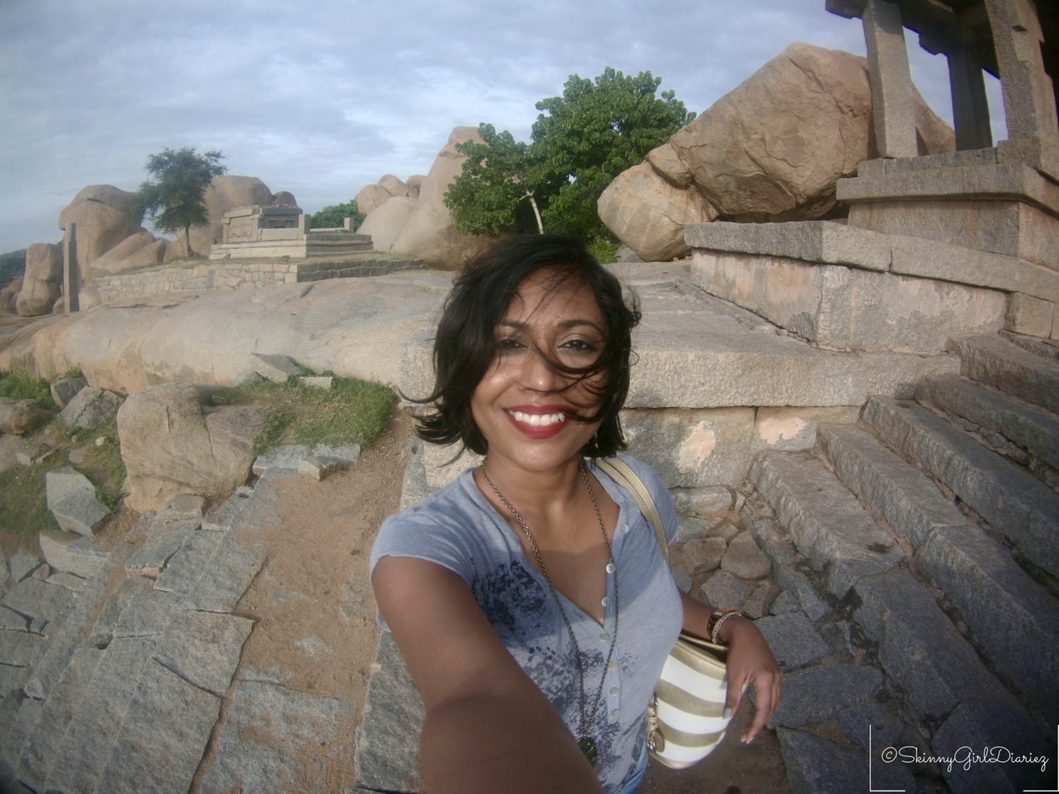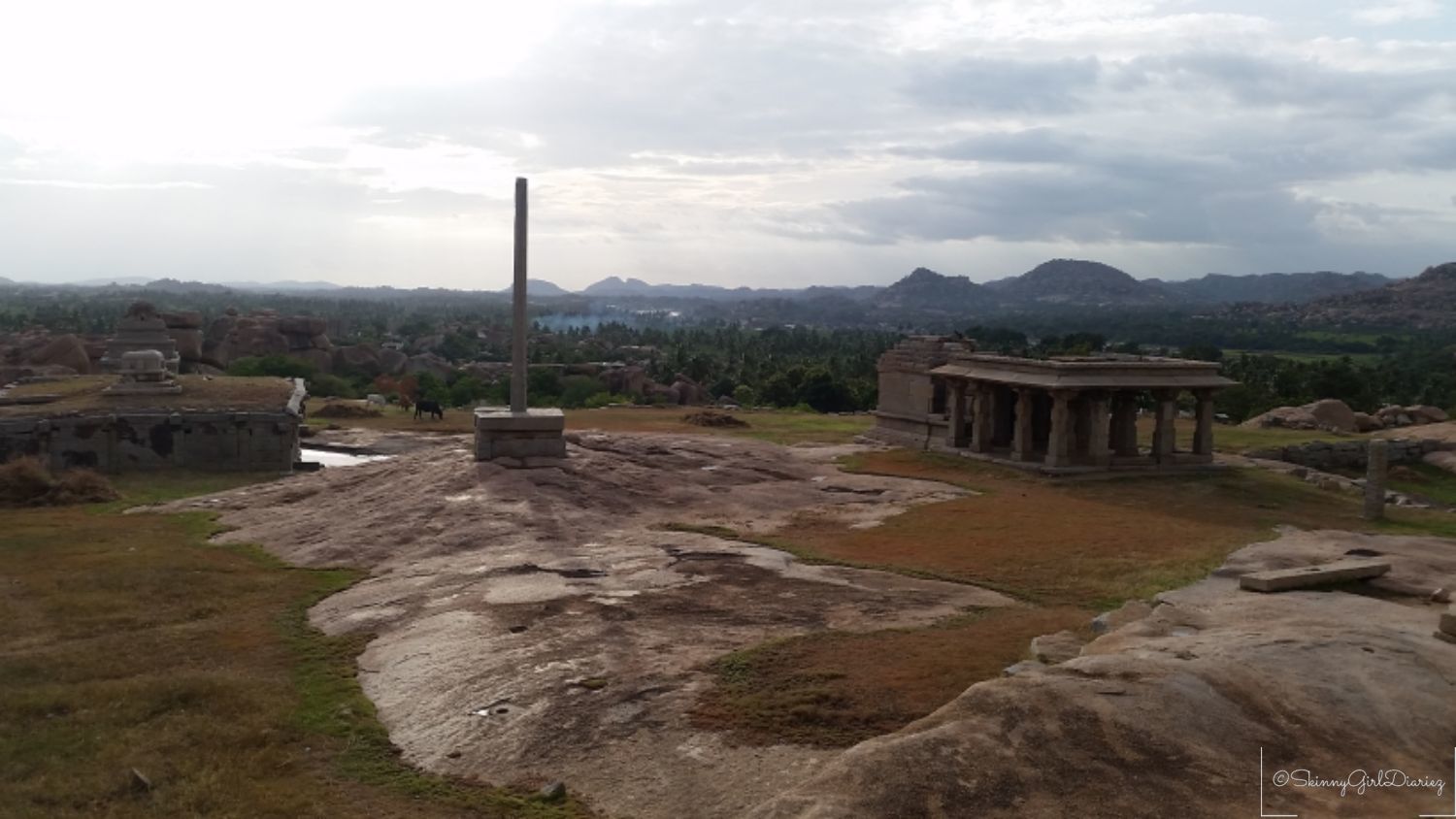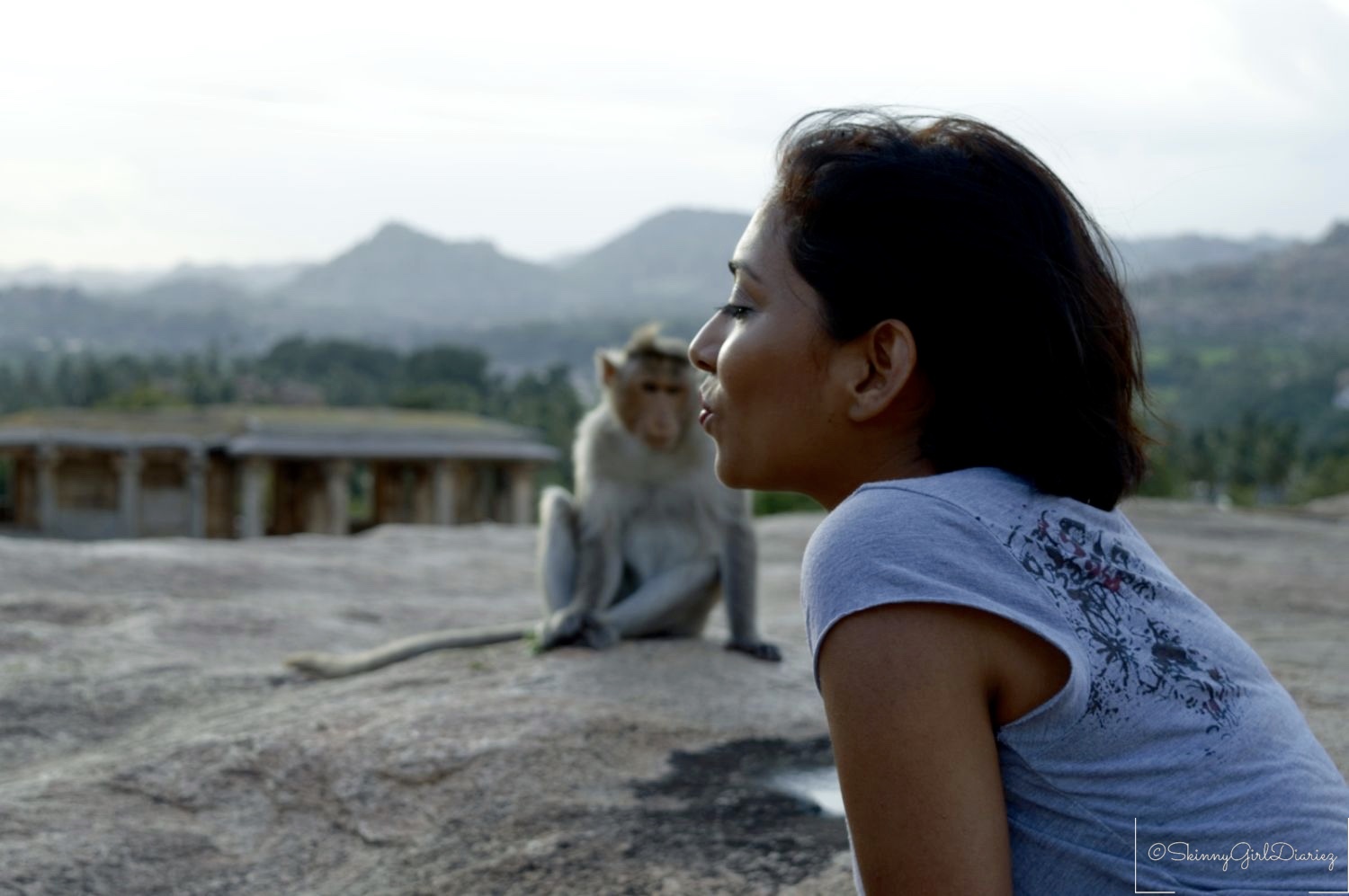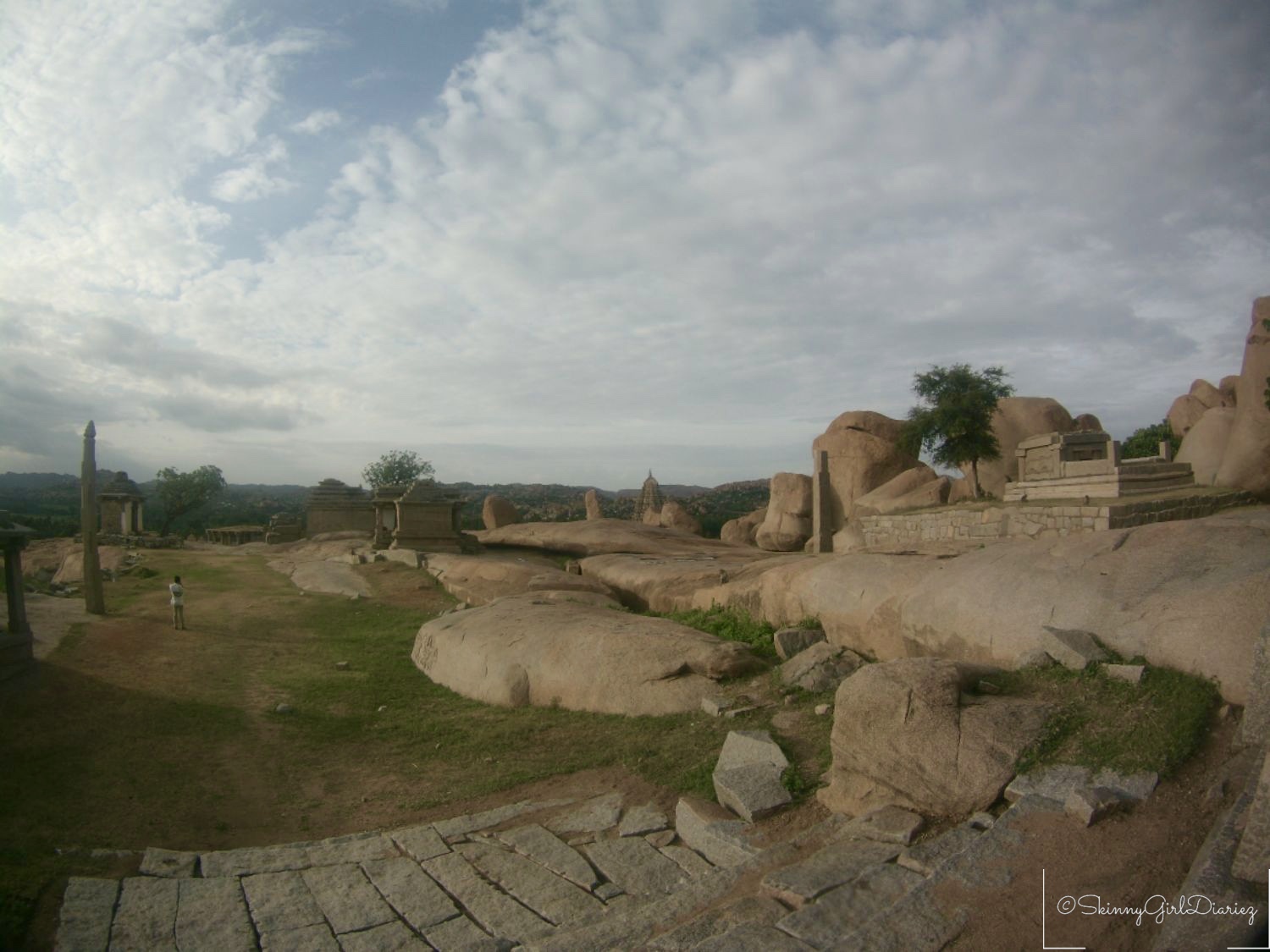 The walk up hill is breathtaking, as you can see. It was almost time for sunset. Once you reach the top of the hill, you get an ariel view of Hampi and there are a large number of temples, archways and pavilions. Another famous temple called the Moola Virupaksha Temple, sits on top of this hill and has a pond that surrounds it, it was surrounded by monkeys taking a dive. It was fun watching them shove each other into the water. The Virupaksha Temple is visible from all the sides. The temperature did dip a bit, and was really windy.