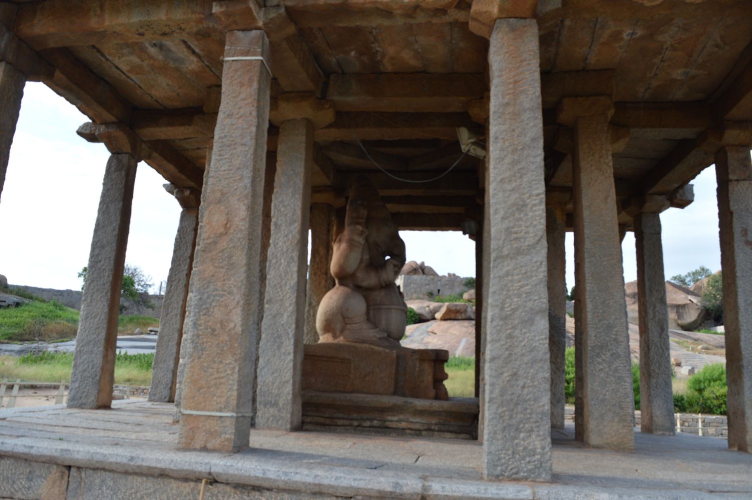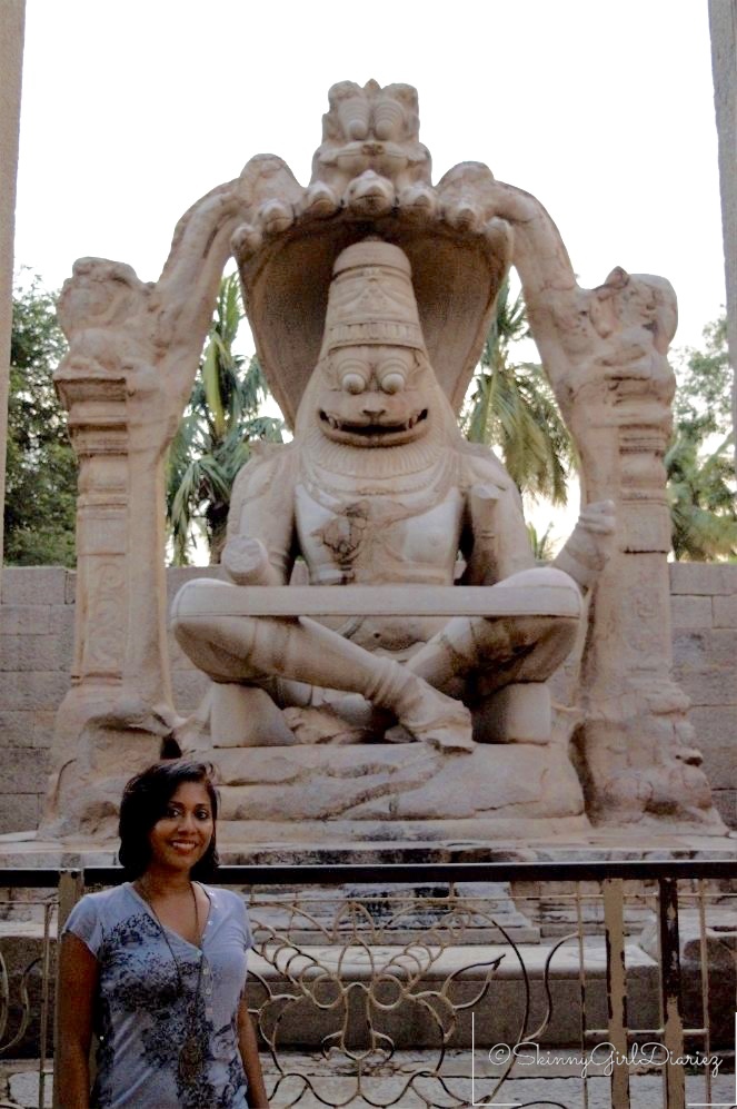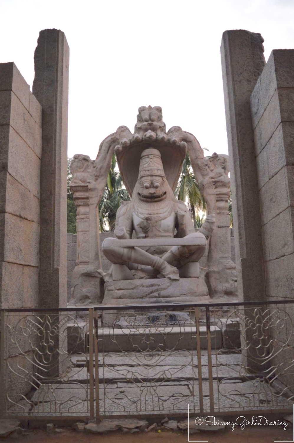 According to legend, Narasimha is the 4th incarnation of Lord Vishnu out of the 10. This is the largest known statue in Hampi. Narasimha means half man and half lion. As you observe the statue you can see a seven headed snake above Narasimha’s head, and he seems to be sitting on the coil of it. He is sitting in a yoga position and has a belt wrapped around his knees for support.