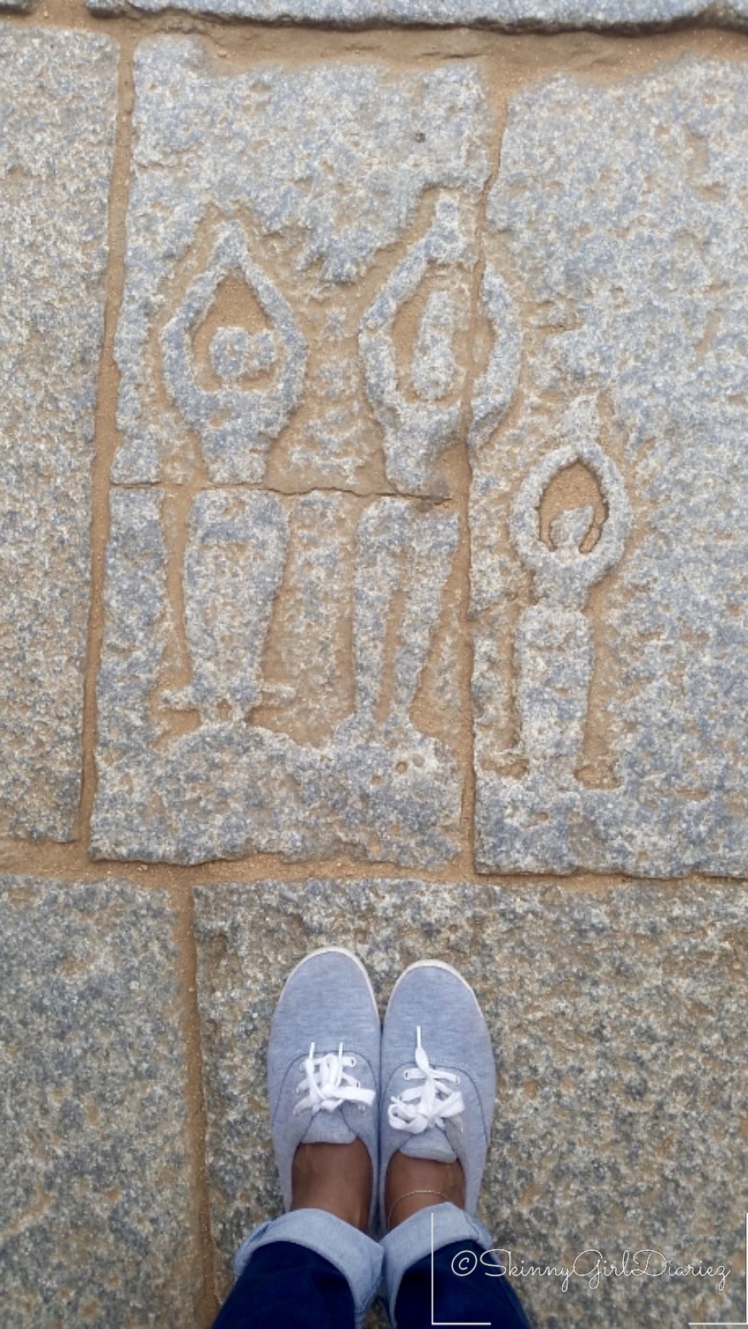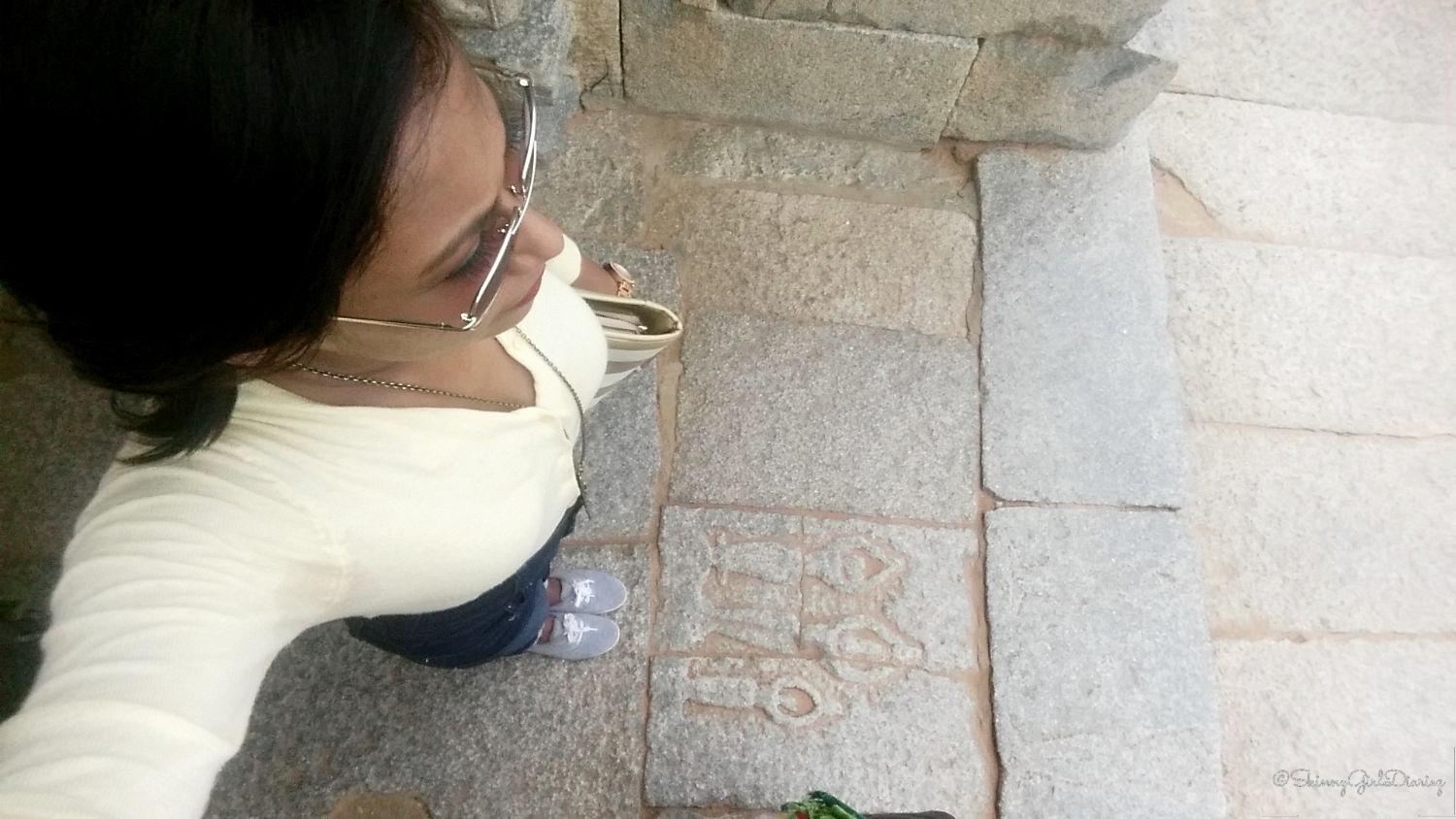 Once we arrive at the temple, the resemblance to the entry of the temple is like the Virupaksha temple. Vittala Temple is a magnificent work of art and showcases some of the finest craftsmanship. The floor of the pathway has depictions of worshipers laying down before the gods as a form of respect. This is found throughout the entry on the stairs.
