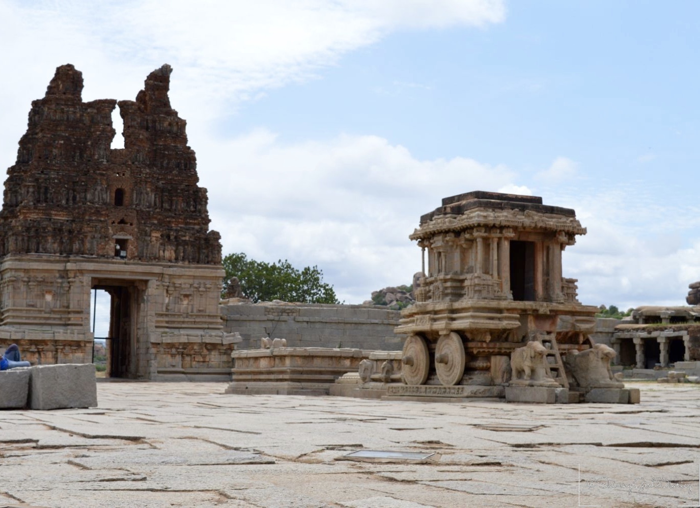 The entire temple is held within a compounded wall, and is a campus with temples, pavilions and halls inside. The main attraction and the most iconic is the Stone Chariot. Around the temple premises the old town of Vittalapura remains in ruins. The entire halls and pillars have carvings of various sculptures.