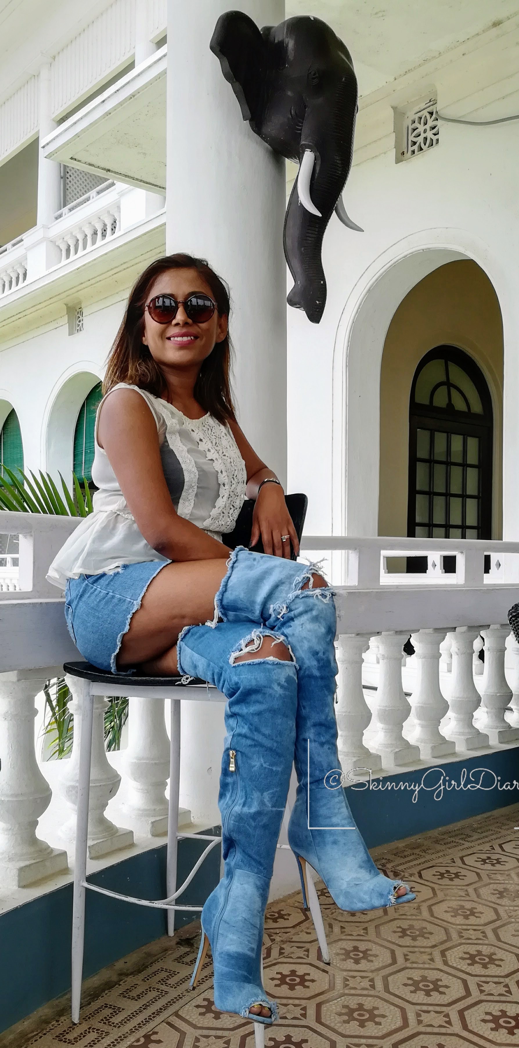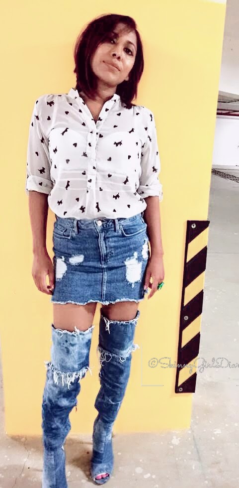 Denim on Denim is everywhere this season. A little late in jumping onto the bandwagon. But I finally took the leap to own a pair of knee high boots and that too in Distressed Denim.