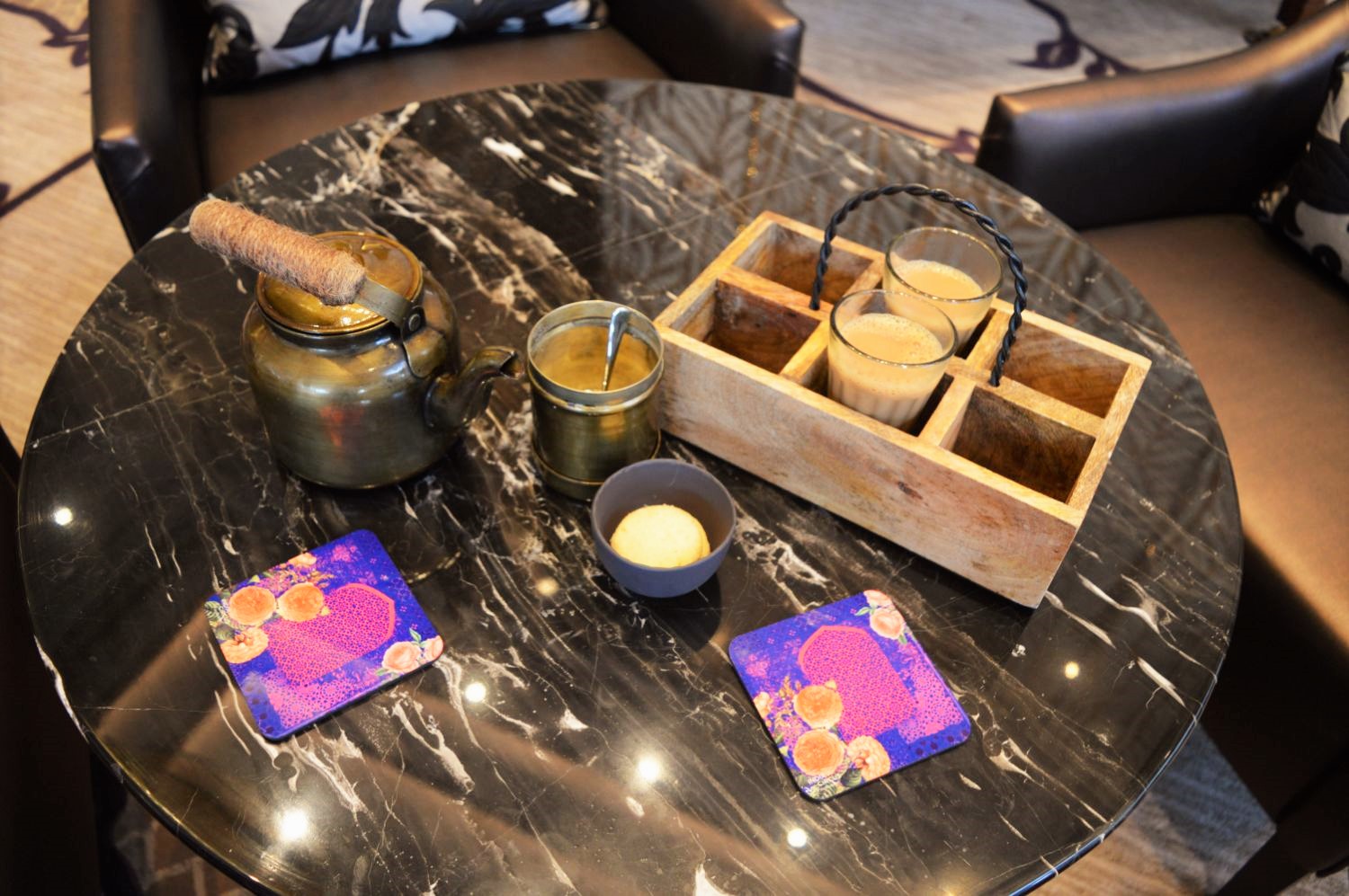 The lobby is the perfect setting for a spot of afternoon tea. The chandeliers that light up the place are appealing and portray pure decadence. I loved it. The huge lobby is so welcoming and you can see the guests walking in and out being greeted by the lovely staff at the hotel. It is a perfect balance. Sitting in a 5-star hotel, and if you happen to face the entrance of the lobby, you’ll have a great time people watching!! Besides my table and across, sat a couple of businessmen in their suits looking all sharp and deep in discussion. The ambiance was just perfect with the light music playing in the background whilst I waited for my tea. I was told it is the only unique style served here in Bangalore city.