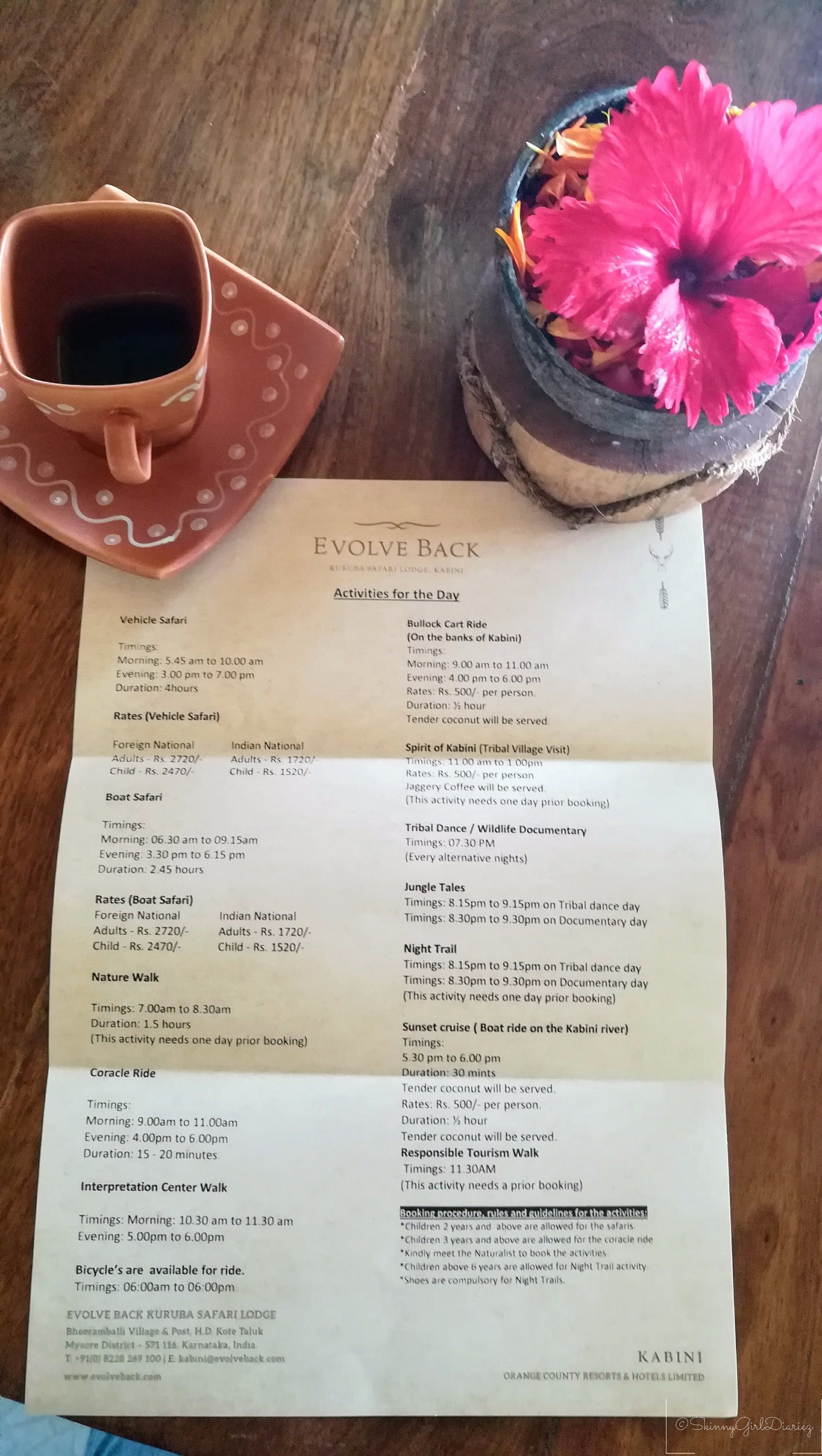 We were greeted by the local guide, on arrival each party gets assigned one. We sat down and had the local coffee, whilst being guided with an already set up itinerary so we waste no time at all. By the looks of it, that next three days were packed with safari, boat rides, nature trails and time out at the Ayurveda spa.